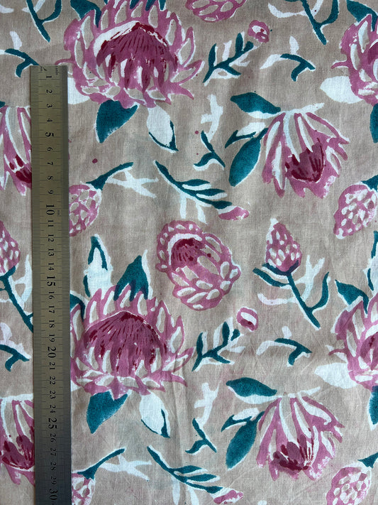 A selection of 100% cotton fabrics that are blockprint fabric or digital print fabric that have tan/natural as their base or accent.