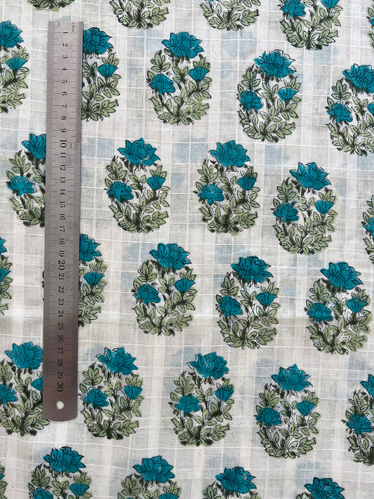 self check cotton fabric | aqua blue floral oval
