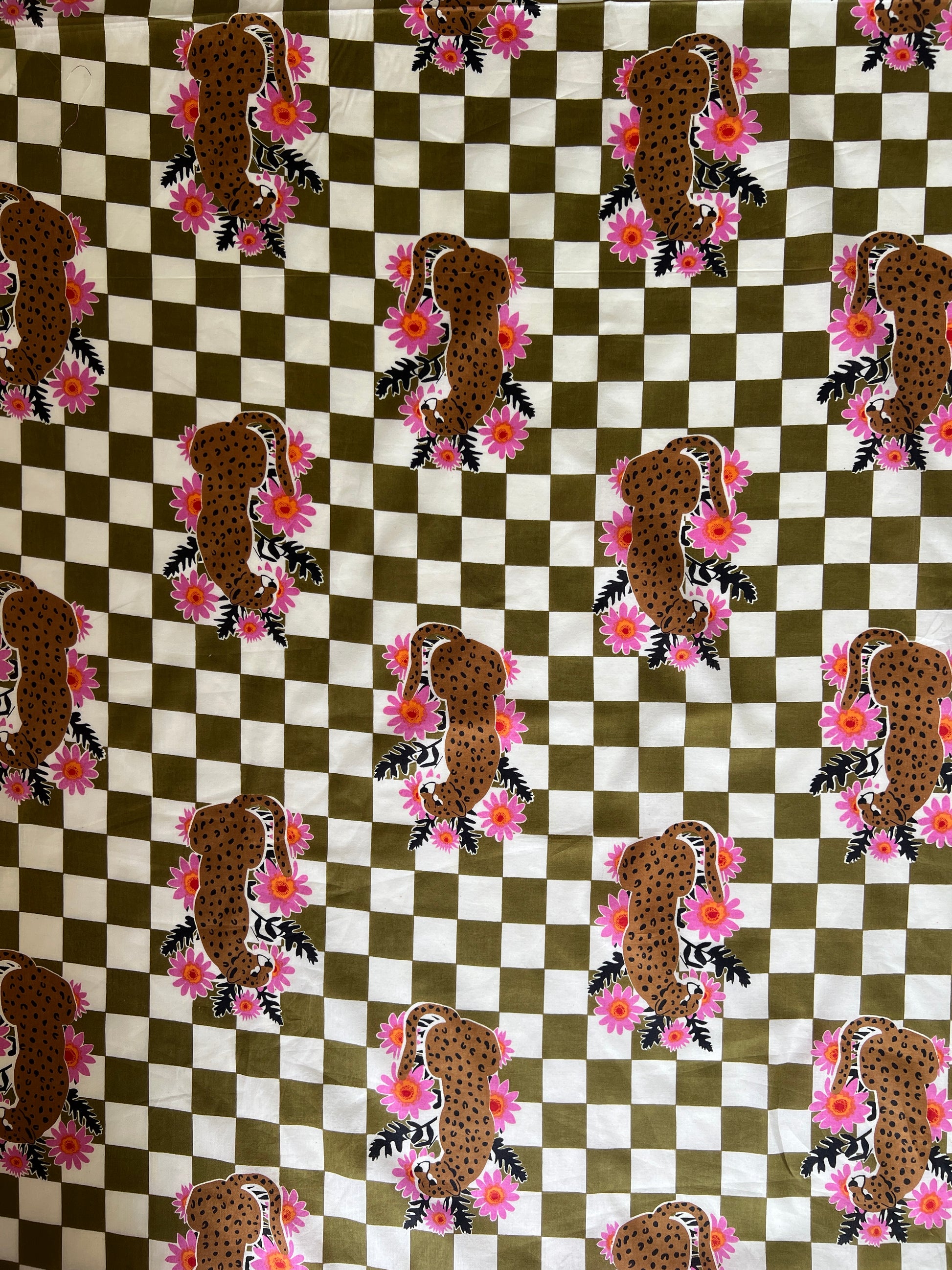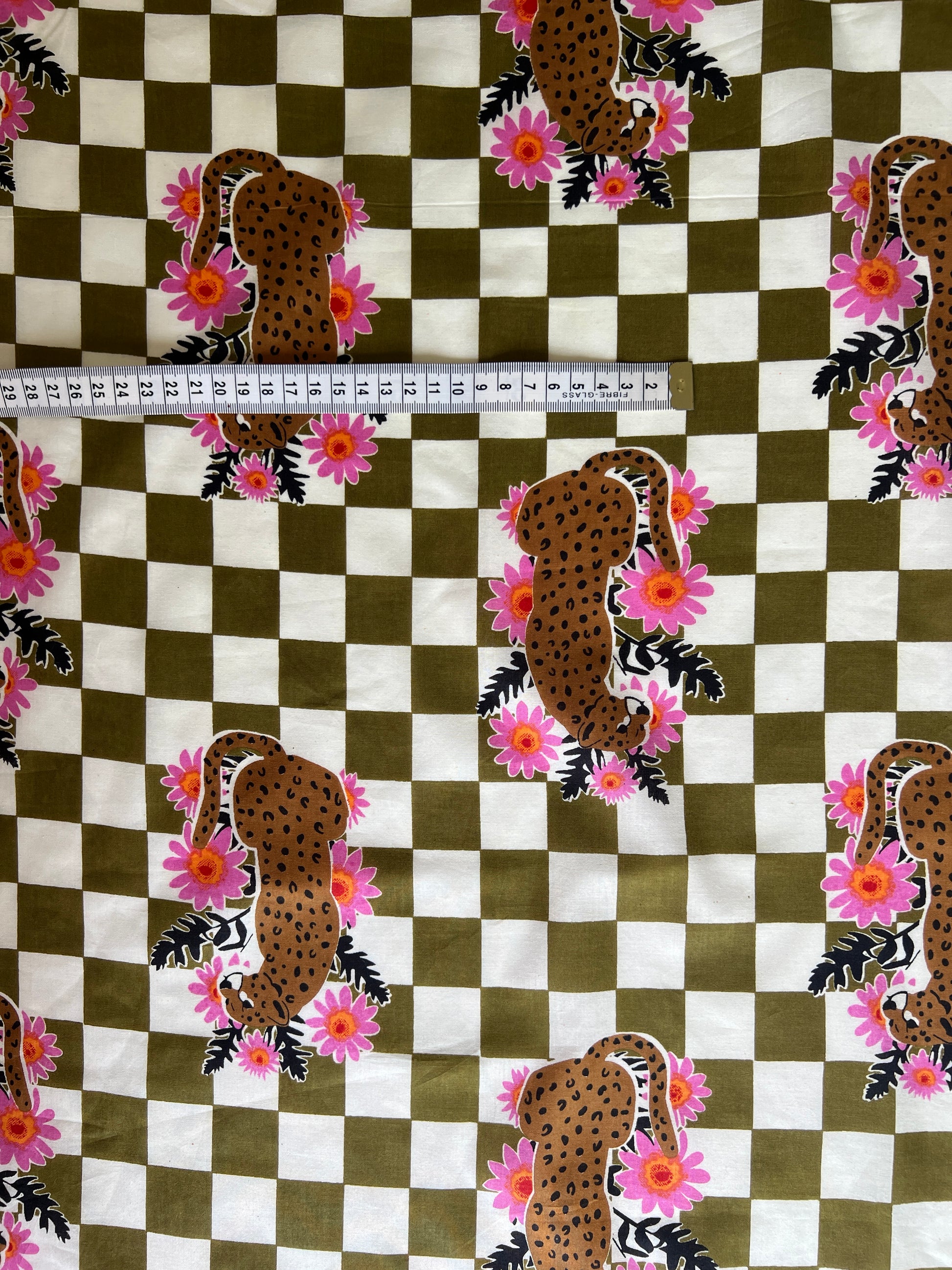cotton fabric | khaki check with leopard and pink flowers